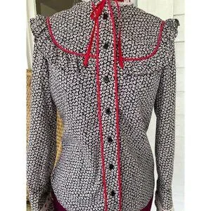 Vintage 1970s Floral Cotton Ruffle Western Shirt Black Red Size Small