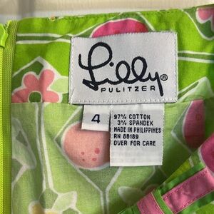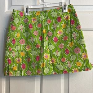 Embrace a playful vintage vibe with this Lilly Pulitzer skort in a size 4. This piece features a vibrant green background adorned with whimsical floral, bee, and ladybug prints in shades of pink, yellow, and orange. Made from a comfortable cotton blend with a touch of stretch for flexibility, this skort offers a unique blend of style and functionality with its skirt front and shorts underneath. Ideal for casual days, it adds a fun and quirky touch to any outfit. Side zipper closure for a perfect fit.