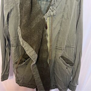 Anthropologie Hei Hei jacket, size medium. Green color. Cascading trim. Layered style. Utility jacket.