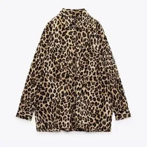 Zara Animal Printed Leopard Oversized Blouse Button Down Shirt Collar
