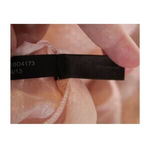 This is a light peach color. It does have a slight pink undertone in certain lights or mixed with something. This is a sheer material with nothing underneath. It has raised pattern detail all over. has a rounded scoop neckline. Then in the middle of the neckline it splits to have V neckline. long sleeves approx to the wrist. The wrist has an slit and button closure at the end. The hemline gathers into an elastic waistline. There is wiggle room in the hemline. found no issues or flaws. smoke free home and pet friendly home. measurements are in the pictures.