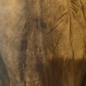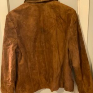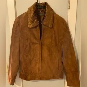 Please look at photos some minor spots. Removeable collar. Very soft suede jacket add to many outfits. Used condition