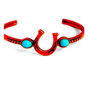 Dotted with dainty copper studs, a thin copper cuff with turquoise stones curls around the wrist. Featured in the center of the design, a tactile-detailed copper horseshoe curves up the wrist for a Western-inspired flourish. As the stone elements in this piece are natural, some color variation is normal.