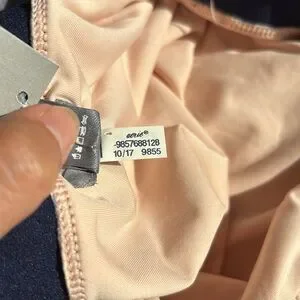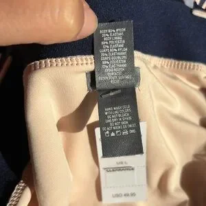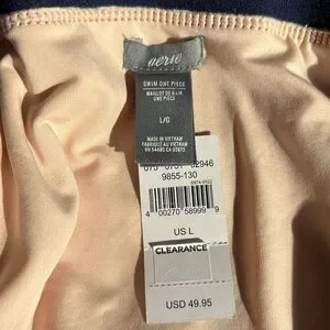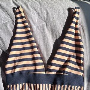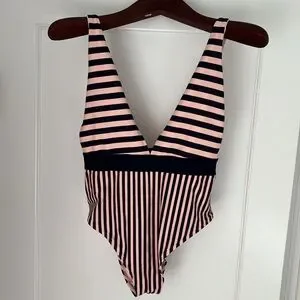 NWT Aerie striped deep V plunge one piece swim suit in size L. Alternating navy blue and blush pink stripes. Wider horizontal stripes on top and below built in elasticized waistband, narrower vertical stripes. Adjustable straps with matte navy hardware. High cut leg. Hygienic liner attached. Suit is fully lined. So sweet!