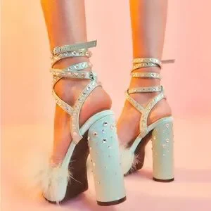 Mint jeweled marabou feather platforms size 7