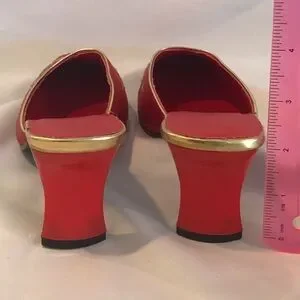 Asian inspired red satin high heel slip ons with a 2 inch heel, embroidered never worn