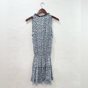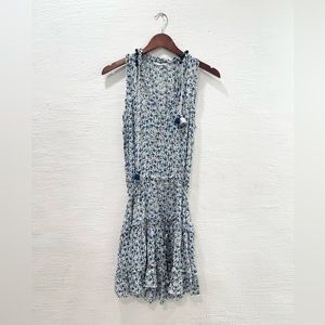 Condition is pre owned. No holes or stains. Ruffled trim at neckline, armholes, and skirt. Round neck, pom-pom trims. Front keyhole, self-tie closure with tassels. Blouson bodice. Stretch-smocked drawstring waist. Flounced skirt. Allover floral print. Pullover style.