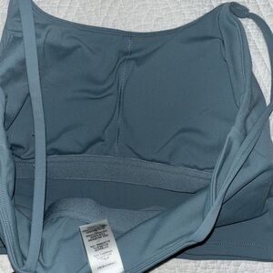 Size medium but can fit a size small because it is tight and stretchy material. Has a great built in bra and very comfortable for exercise or casual wear. Color is a teal/blue