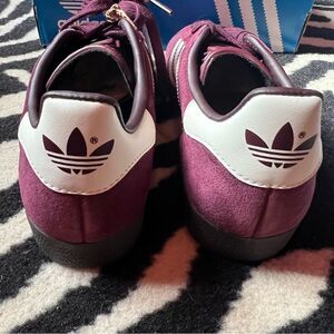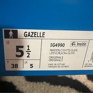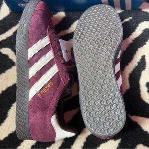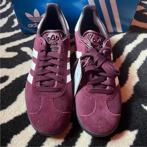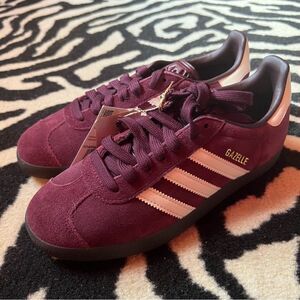 Brand New NWT Adidas Gazelle Originals Sneakers in Maroon Size Men 5.5/Women 6.5. Gorgeous on trend oxblood burgundy cherry mocha wine color 🍒. Never worn and box included. Sold out on Adidas site. These are a Men 5.5 but fit a Women size 6.5 according to the Adidas size chart. I think they run a bit big so please read sizing reviews. *Will ship same day if ordered before 12pm Est M-Sat excluding holidays.
