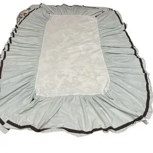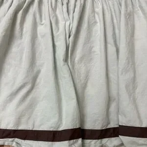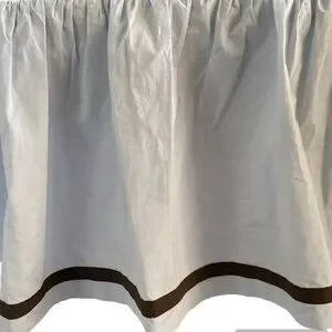 EUC 100% cotton very light blueish mint in color with chocolate brown detailing trim, machine washable, 15” ruffles drop, 55” wide.