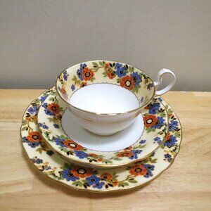 Beautiful and vintage, this "Aynsley Teacup Trio" set from England is a stunning addition to any collection. Made of fine Bone China, the set includes a teacup, two saucers, and a bread/butter plate, with the extra orphaned saucer included. The blue and orange floral pattern with gilt trim and vibrant multicolor design adds a touch of elegance to any occasion. Hand wash only to preserve its original beauty." "Perfect for tea parties or display, this four-piece set features intricate flower-themed details and a wide decorative beige band. The teacup has a D shaped handle for easy handling. Each piece showcases craftsmanship from the United Kingdom and is a true vintage find. Add a touch of sophistication to your table setting with this Aynsley brand teacup trio set.