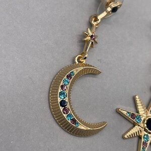 Moon & Star Multicolor Rhinestone Long Dangle Drop Earrings Gold Tone