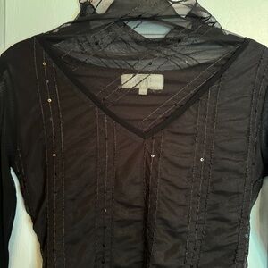 Unique mesh long sleeve top from vintage brand Vitae, featuring a mesh top panel with a turtleneck which goes into a sheer V-neck, all over sequin details, and a cute ruffled hem divided from the top with a knit band. Fabric feels like nylon or polyester. Has some stretch. Perfectly dark vibes for the fall and winter 🖤