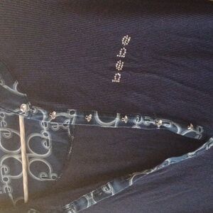 womens medium bebe collard long sleeve top. can button up with rhinestone buttons or leave unbuttoned as plunged neck. navy blue with gemstone bebe label and retro style collar.
