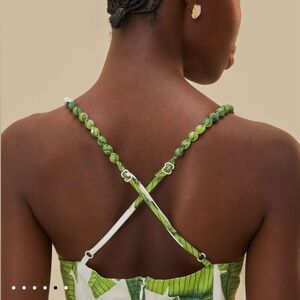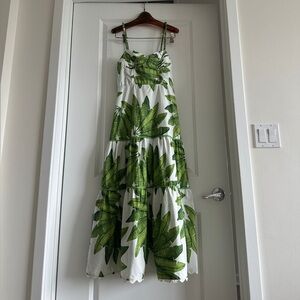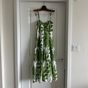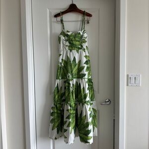 Breathe in the tropical allure of the Palm Fan Off-White Midi Dress, adorned with a refreshing green palm leaf print. This enchanting piece features a flattering sweetheart neckline and playful braided straps, creating a harmonious symphony of natural elegance and graceful femininity. The tiered skirt dances around the mid-calf, promising to whisk you away on an endless summer adventure with every swish. Indulge in the beauty of nature elegantly draped in this exquisite FARM Rio creation.