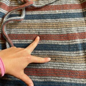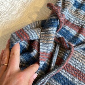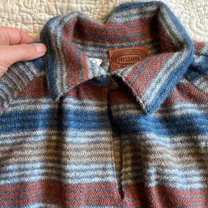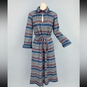 Vintage Missoni striped collared keyhole neckline wool dress with pockets, 1970s 1980s. Gorgeous earthy yet vibrant knit stripes in blue, orange-red, light grey, and yellow-tan. Belt loops, removable belt, collared with keyhole neckline with button to be worn open or closed, sleeve cuffs are turned up and stitched. Labeled size 42, equivalent to modern 8, listed as medium since it has some flexibility in sizing due to knit and elastic waist/belt.