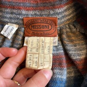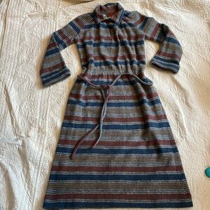 From original seller: "Incredible 70s 80s Missoni striped wool dress. Fabric content is 80% wool and 20% nylon. Has a matching tie belt. Excellent vintage condition! Only flaw to note is that elastic is worn out at waist. Not really an issue if you plan on belting it.