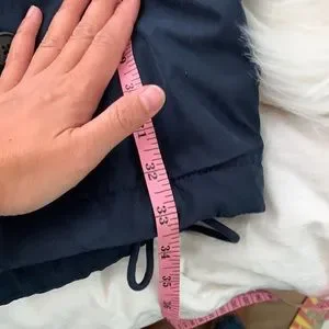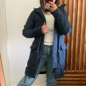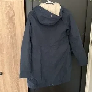 ::Features: missing fur hood insert/ zip front/ large front pockets/ fleeced lined/ very warm/ long knee length/ navy
