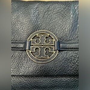 Black leather folder over convertible clutch purse. Clutch size 13”w x 7.5”h, extended 13”w x 15”h. Gold hardware. Removable crossbody strap extends to 26”. Interior zipper factory wrapped. Comes with dust bag. Never worn.