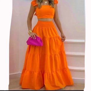 Orange Ruffle Top & Bottom Orange 2-piece Dress Skirt Crop Short Sleeve NWOT