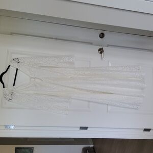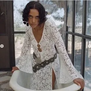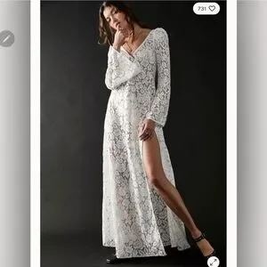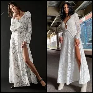 Gardenia Lace Maxi Cut with a Plunging Neckline, Low Scoop Back with an Adjustable Tie Detail Across Back Shoulders. Semi-Sheer Flared, Bell Long Sleeves.
