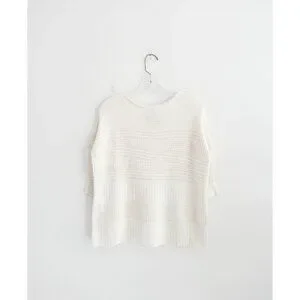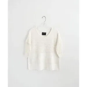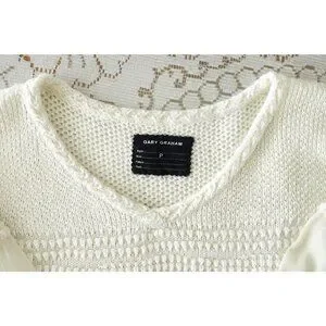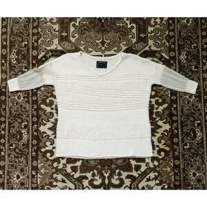 Gary Graham Ivory Cotton Silk Drop Shoulder Boxy 3/4 Sleeve Sweater size Petite / Extra Small, small snag and run on sleeve--pics 5 and 6, scoop neck, dropped shoulder seams, 3/4 sleeves, boxy cut, straight hem, alternating bands of popcorn ribbed knit and zig-zag ribbed knit, crepe georgette woven sleeves with knit cuffs, finished by hand distressed by artisans, 100% cotton, 100% silk, 75% modal, 25% nylon, ~23" across shoulders, 22" pit to pit, 21.5" shoulder to hem, 10" sleeve, 18" collar to cuff