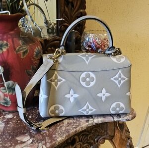 Authentic Louis Vuitton Empreinte Monogram Giant Madeline MM in Dove Grey. Microchipped. Preloved condition. Extremely clean inside. Push lock, sticker still in tact. 1 zip pocket 1 slip pocket. Dustbag, Clochette. Adjustable strap. No stains, rips, tears. Added a LV Silk Monogram By the Pool Bandeau in Blue w/box! NO TRADES unless u have something Fabulous