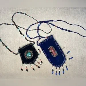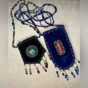Hand Beaded & Fringed Velvet Amulet Bags / Pouches ~ outlined and designed with hundreds of stones & glass beads