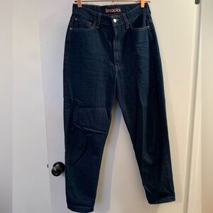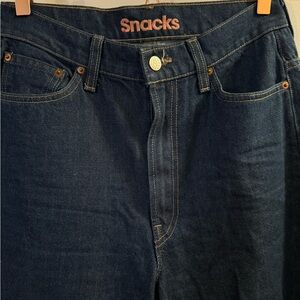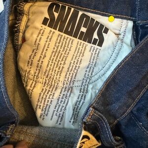 Just a nibble: SNACKS! From MOTHER takes cues from throwback styles of the '80s and '90s, reimagining them with more exaggerated shapes and extreme proportions. The slouchy, oversized jeans feature super-high rises, deep pleats, drop crotches, and inseams that puddle at the hem. Made of rigid 100% cotton, these styles channel the nostalgia of snack time with pretzel-detailed buttons and candy-coated rivets that look good enough to eat.