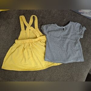 Yellow overall skirt with Pooh's face on the front, criss cross straps in the back with 2 size button options. Matching black and white striped short sleeve tee with tie embellishments on the sleeve and a button in the back of the neck.