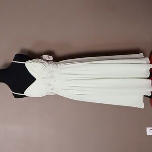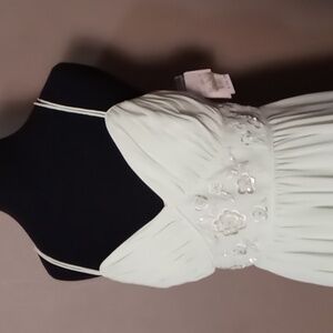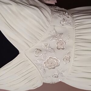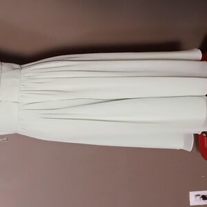 David's Bridal Crinkle Chiffon Honeydew Dress w Embellishments Size 8. This is light green with inside lining. This is in excellent condition with no holes or stains.