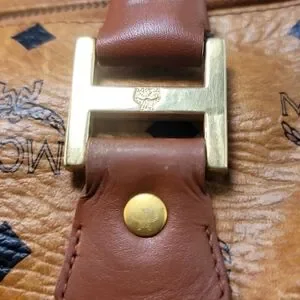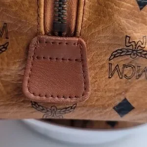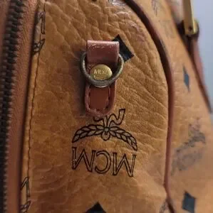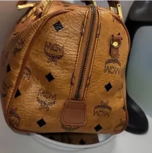 AUTHENTIC MCM Visetos PVC/Leather Mini Boston Handbag Brown Gold .