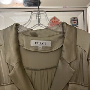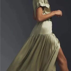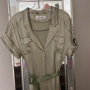 This size XL Anthropologie (Elliott) dress is absolutely stunning in light moss green. Made of 100% Viscose (including the belt) which gives it a beautiful sheen. Button down. Is true to size. Two upper pockets. Worn once but has no flaws or pulls in fabric. The attached belt is a deeper green which is a stunning contrast. She’s a beauty. No longer fits me.