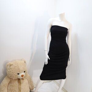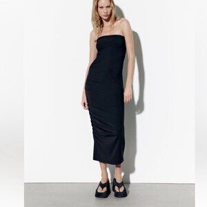 Elevate your style with this Zara strapless ruched black midi dress. Designed to flatter, this dress features intricate ruched detailing along the sides, creating a sleek silhouette. The strapless neckline adds a touch of sophistication, perfect for both formal and casual occasions. Made with high-quality fabric, this dress ensures both comfort and elegance, making it a versatile addition to your wardrobe.Strapless knit fabric fitted dress with straight neckline.Ruched fabric.Side hidden in seam zip closure