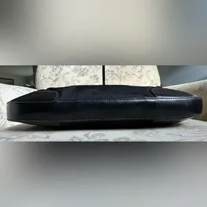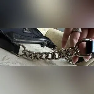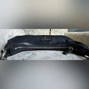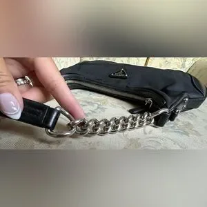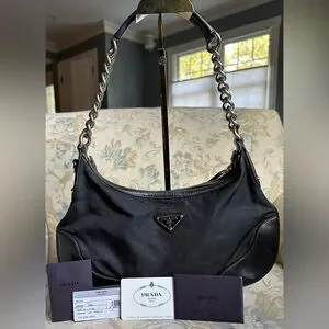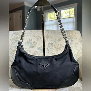 100% Authentic Prada Shoulder Bag w/original Authenticity cards/tags. This screams Y2K with its curved shape and chunky silver hardware strap and is pre-loved with some light fading & moderate discoloration residue on outside material mostly on front. No rips or tears. Please note it is a vintage piece so does show wear on leather, light wear & patina on handles but is in nice condition for its age. I love this bag-can hold all your essential items on date night or a night on the town with the girls. See pics for more details.