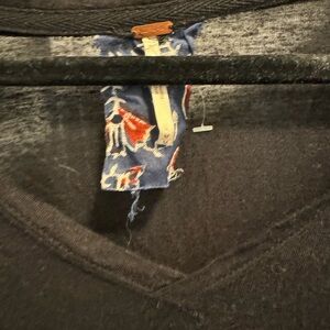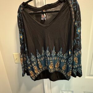 I honestly do not remember wearing this, but the tag is not on it. Bell sleeves and has slight elastic waist at bottom. Great colors and truly a Free People style top! Black blues and light gold design. Like a FP things it is a bit oversized.