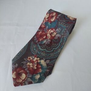Floral grey blue and red silk tie 80s or 90s vintage indie retro boho