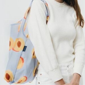 NWT, eco-friendly, reusable, tote, durable, fruit, peach, 🍑 , orange, light blue background, lightweight, colorful print, iconic, sturdy, quality, travel, sustainable, gym bag, beach bag, functional, daily errands, regular version, standard size