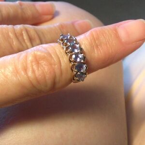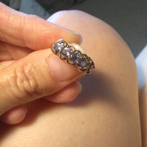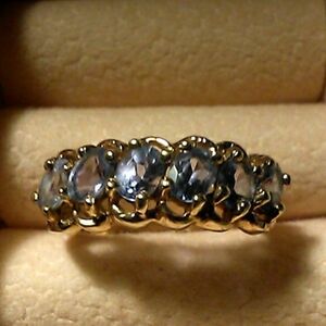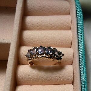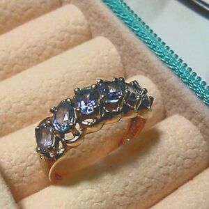TANZANITE STONES ARE RARE AND WILL BE GONE FOREVER WITHIN YOUR LIFETIME OR YOUR CHILDRENS LIFETIME. THIS IS A 10 KT. GOLD RING AND IT HAS 6 RARE TANZANITE SET ON THE TOP IN A SEMI-CIRCULAR SETTING. THESE ARE A BEAUTIFUL LAVENDER COLOR AND THEY ARE AN OVAL SHAPED CUT. EVEN IF YOU ARE NOT INTERESTED, PLEASE RESEARCH TANZANITE AND UNDERSTANDING THEIR HISTORY AND DISCOVERY IS VERY INTERESTING.