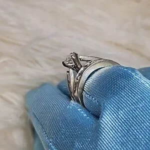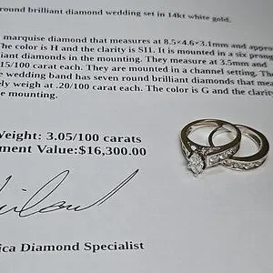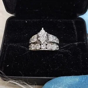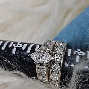 This gorgeous, bright, excellent quality natural diamond wedding set is stunning. it's just over 3 carats tw. The center Marquis natural diamond is approximately 0.75 carat. The channel set accent diamonds and band are exquisite. you can read all about the details with the current appraisal. This set has been appraised at $16,300. this set has not been worn since picking up from the jeweler yesterday. The jeweler stated that the ring is sound and ready to be worn. I am open to serious offers.