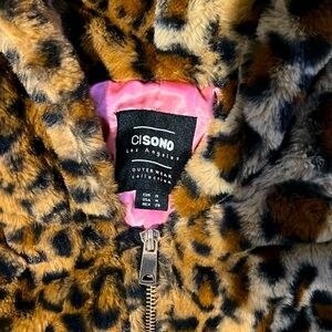 SOLD - CiSono Faux Fur Leopard print bomber style zip up jacket with hood