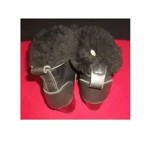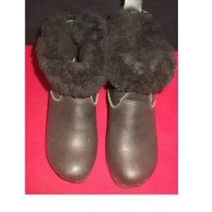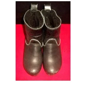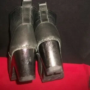 A pair of No.6 Store handmade black leather shearling-lined pull-on rubber-soled heeled clog-boots. The boots may be worn "shaft up" or with the shaft folded down for a shorter boot that shows the shearling lining. The shearling is authentic and the boots are in good condition. The only wear of any note is a tad at ends of heels and a few scuffs and nicks - one notable nick -- on rear of heels. Marked 36. Heel 3" Height 6.5" with shaft "up" with shaft folded down 6" Width 3" Length measured against wall with tape measure underneath 9.5"