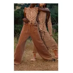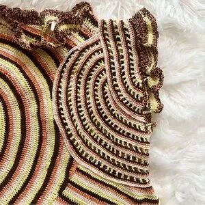 The Aurora Top is made from Italian-sourced Pima cotton that’s hand-crocheted in a hypnotic, swirling pattern inspired by the paintings of artist Danielle Riede. This multi-colored sleeveless top has an elegant high neck and is adorned with ruffled trims, adding to the top’s feeling of movement. Elevate your trouser or denim look for a fun eveing out.