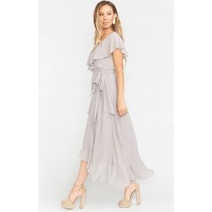 NWT The Jess Ruffle Midi Dress is an easy to wear mock wrap dress that gives you the flattering appearance of a wrap but the security of an elastic waist and sash. Her ruffled v-neckline is long enough to cover your the top of your arms for a flirty flounce! She has a high-low hemline to show of your shoes with a gentle ruffle along the hem that goes all the way up the slit.