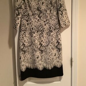 Black and cream lace print dress by Adrianna Papell. Size 10 and fully lined. Beautiful shift dress with covered back zipper. Perfect for weddings and semi-informal occasions. Fabulous boat neck and fitted waist. Packs well. Hits at knee: 39 1/4". Material: 100% polyester. Care: Machine Wash Cold; Only Non-Chlorine Bleach When Needed; Tumble Dry Low; Cool Iron if Needed.