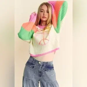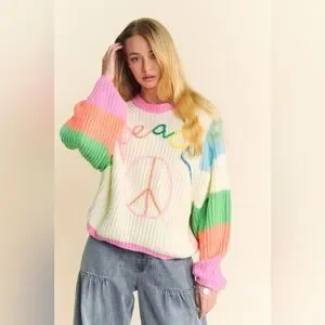 Get cozy and spread good vibes with our Multicolor Striped Peace Sign Balloon Sleeve Sweater. The multi-striped balloon sleeves add a playful touch while keeping you warm. Perfect for those who love to stand out and embrace a quirky style. The multicolor striped pattern adds a lively touch, while the oversized balloon sleeves add a playful twist. Be unique and stay cozy!