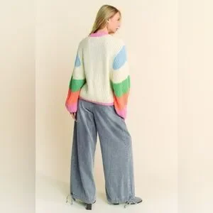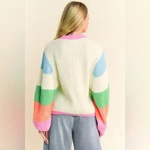Multicolor Striped Peace Sign Balloon Sleeve Sweater - Davi & Dani