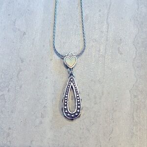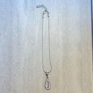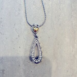 Brighton pendant necklace with teardrop charm. Stones and heart details. 16-18” chain with claw adjusting clasp. Silver.