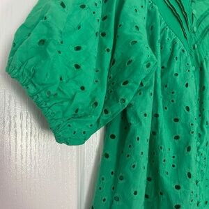 NWOT Green Eyelet Top with button detail, short puffy sleeves, size small