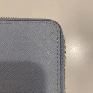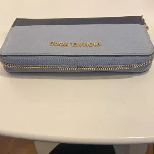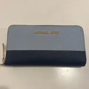Authentic Michael Kors Zip Around Wallet/Phone Case *IT IS MISSING THE WRISTLET STRAP* Item is pre owned and it has a stain along the zipper and an ink dot on the front. Please see the photos for blemishes! Bottom is navy and top is a lighter blue.